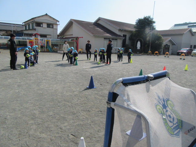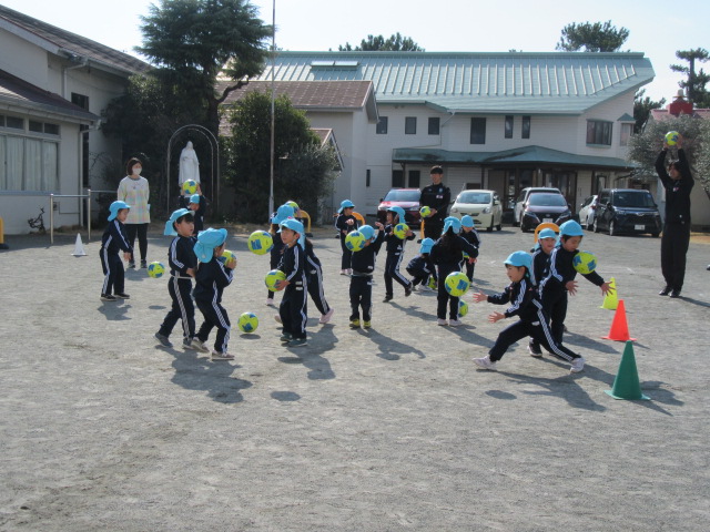 今日は湘南ベルマーレのコーチが来て、サッカーを楽しみました。年中のすみれ組も少しずつ慣れてきて、伸び伸びとボールを追いかけていました。