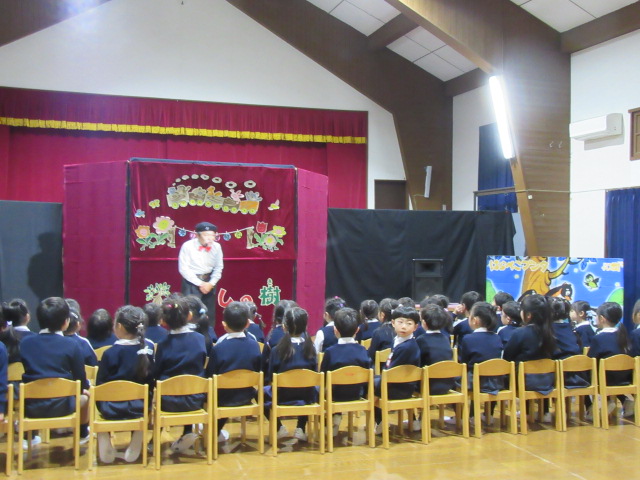 今日は、影絵劇団「かしの樹」の方々に来ていただき、みんなで影絵を鑑賞しました。前半は影絵に使う人形を見たり、光の当て方で変わる影の不思議を体験し、後半は「はらぺこプンタ」というお話を楽しみました。大盛り上がりでした!