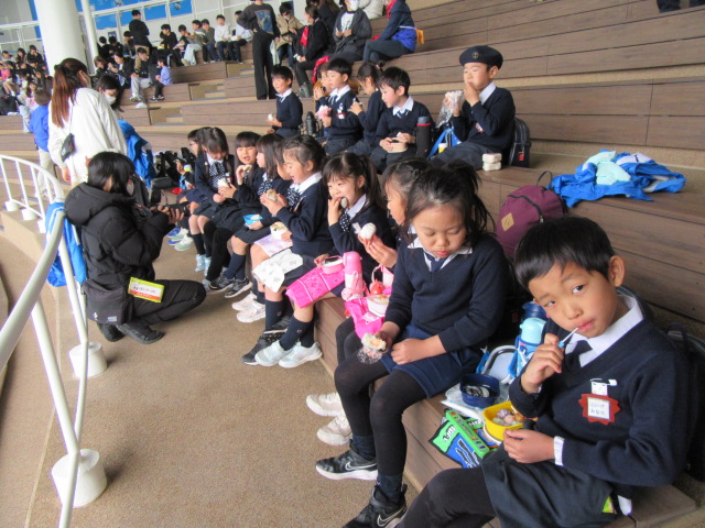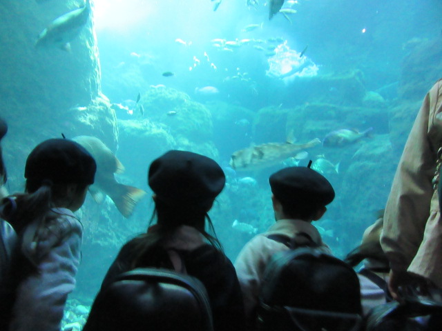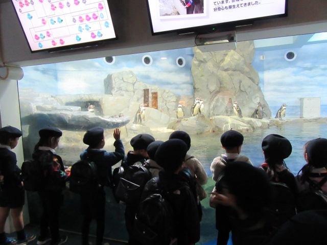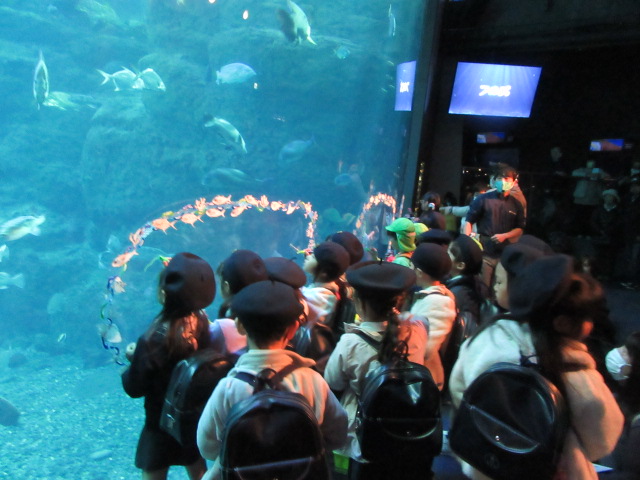 今日は、年長組のお別れ遠足で、江ノ島水族館に行ってきました。大きな水槽で泳ぐたくさんのお魚やサメ、きれいなクラゲやかわいいペンギンなど、見どころは盛りだくさんでした。中でも、イルカショーは前列の席になってしまったので、レインコートを着ていつ水がかかるかはらはらドキドキしながらイルカさんたちを応援しました!
