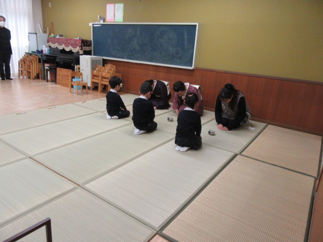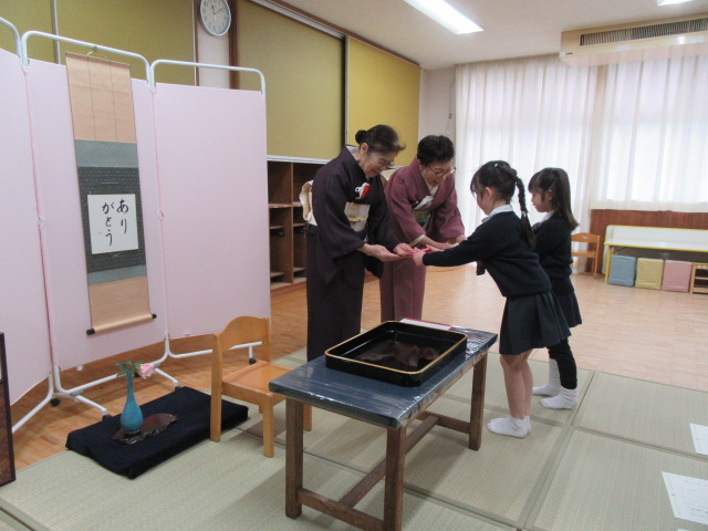 今日は今年度最後のお茶ごっこでした。おわりに「おしるし」をいただき、お茶ごっこを卒業しました。この一年間の成長にお茶の先生方も感激していらっしゃいました。