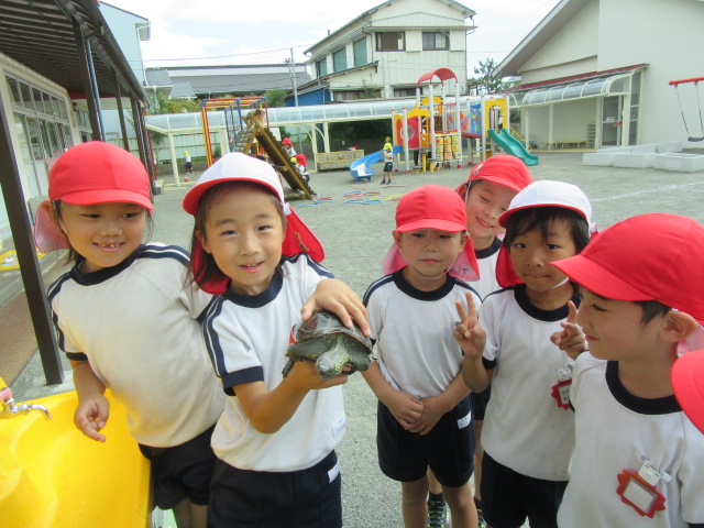 今日は年長組の子どもたちが、水槽の水を変えたり、かめきちを洗ったり、園庭でお散歩もしてくれました。