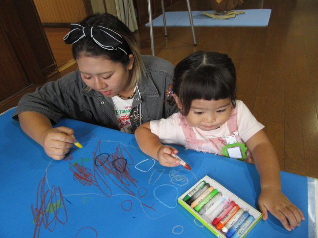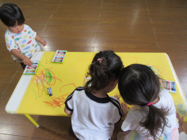ほしのこクラスの活動は、3色の大きな紙にクレヨンでお絵描き。色々な色のクレヨンで楽しみました。