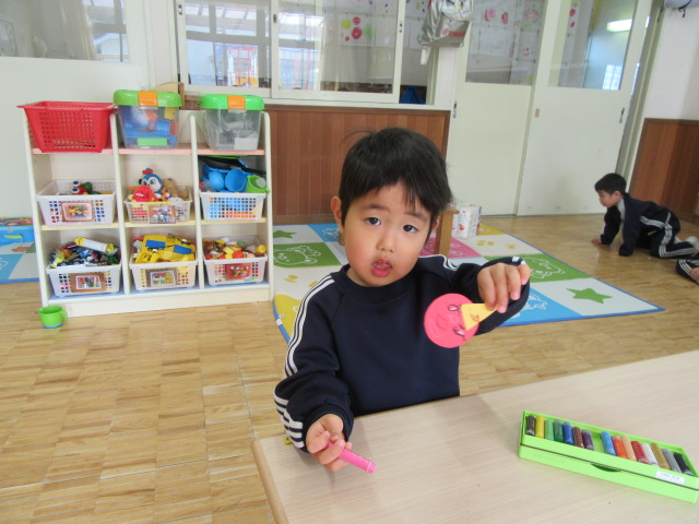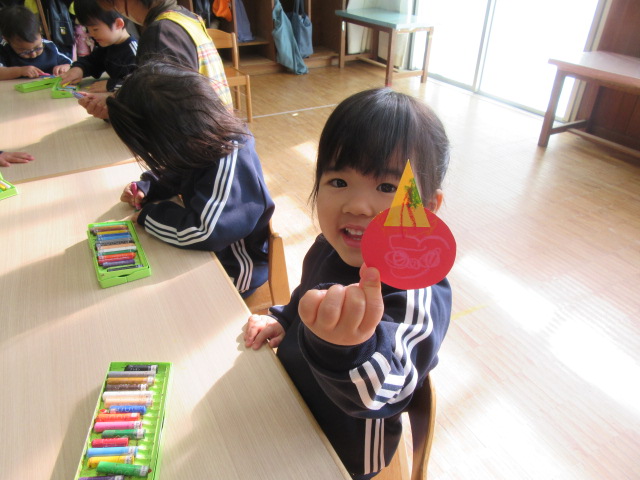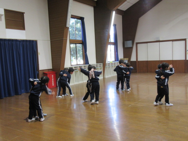 今日、年中組はホールで「あかおにとあおおにのタンゴ」というダンスを踊りました。途中2人組になって踊るタンゴ調の振付にみんな照れたような笑顔を浮かべながらも、生き生きと張り切って踊っていました。年少組は、鬼の豆入れ作りました。節分の豆まきに向けて、それぞれ季節感のある活動を楽しみました。