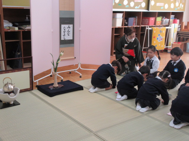 今日のお茶ごっこは、年長組が年中組をご招待して、おもてなしをしました。年中組は、年長組が運んでくれた初めてのお抹茶を、少し緊張した面持ちでいただいていました。