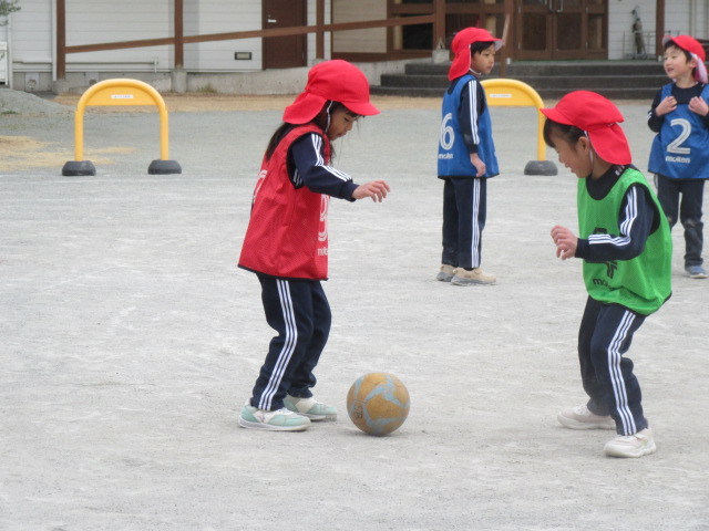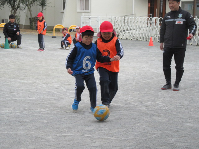 今日は、湘南ベルマーレのコーチが来てくれて、サッカーを楽しみました。年中組も年長組も学年に応じたプログラムをテンポよく指導してもらい、寒さに負けず元気にボールを追いかけました!