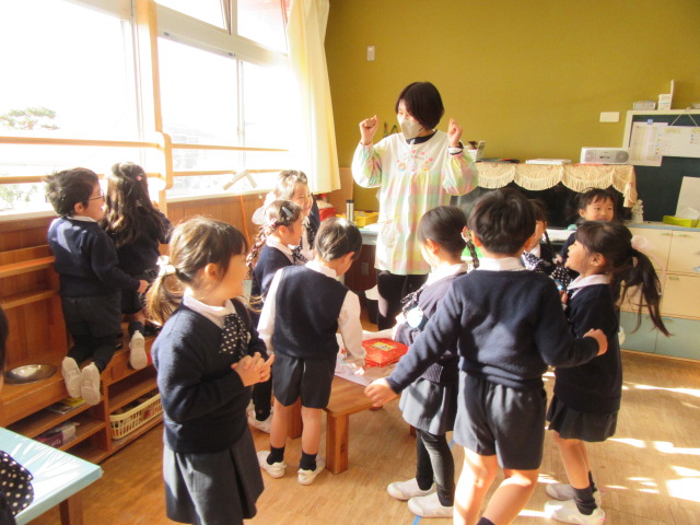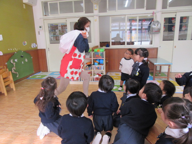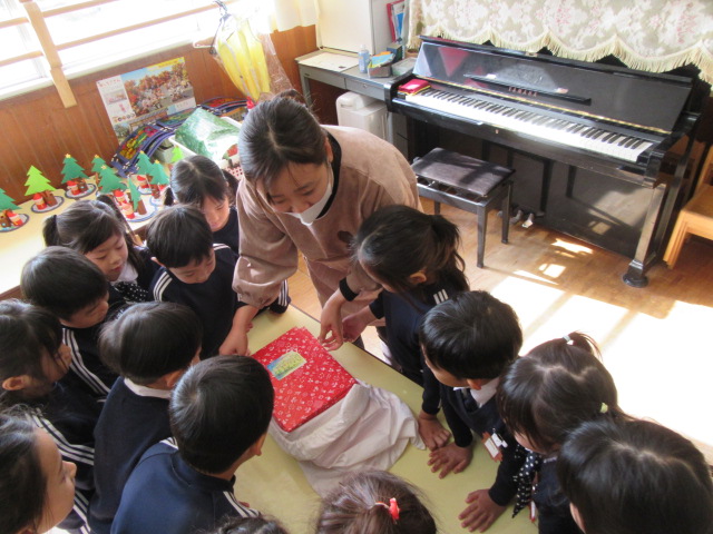 今日はホールに集まって、クリスマスパーティーを楽しみました。それぞれの学年の発表のあと、サンタさん来てくれるかな?と、ソワソワしながら♪あわてんぼうのサンタクロースを歌っていると「鈴の音が聞こえた」とか「赤い服が少し見えた」などの声があがりました。お部屋に戻ってみるとそれぞれのクラスにサンタさんからのプレゼントが届いていました!