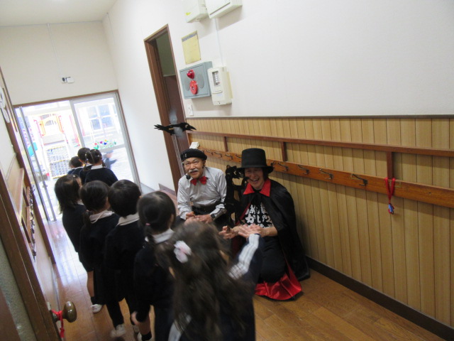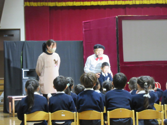 今日は、影絵劇団「かしの樹」の方々に来ていただき、みんなで影絵を鑑賞しました。前半は影絵に使う人形を見たり、光の当て方で変わる影の不思議を体験し、後半は「はらぺこプンタ」というお話を楽しみました。大盛り上がりでした!