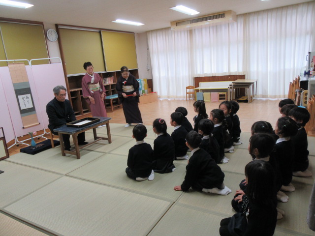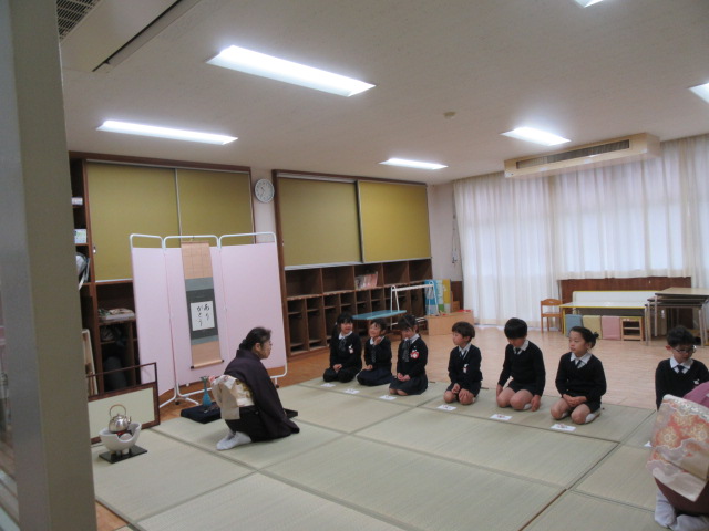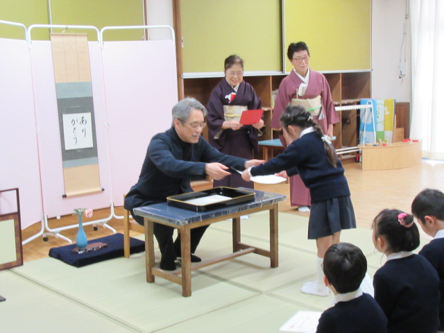 今日は今年度最後のお茶ごっこでした。おわりに「おしるし」をいただき、お茶ごっこを卒業しました。この一年間の成長にお茶の先生方も感激していらっしゃいました。