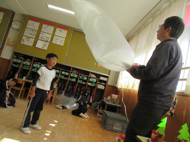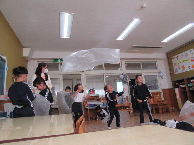 「空気は温まると軽くなる」ことを実験しました。ビニール袋にドライヤーで熱風を送り、温かい空気を袋に閉じ込めて、天井に舞う様子を楽しみました。