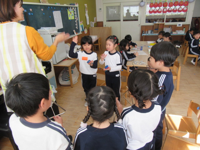 年中組は初めての楽器練習でした。ピアノの周りに集まって、先生のお話を真剣な眼差しで聞き、集中して奏でる姿に成長を感じました。