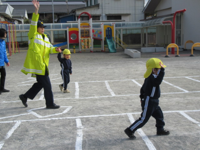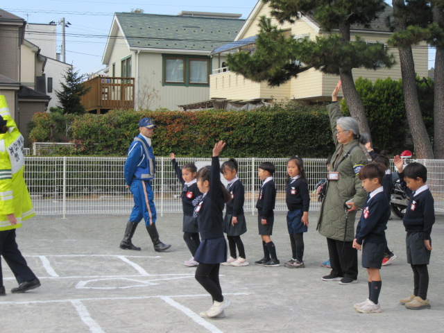 今日は大磯警察の方に来ていただいて、道路を渡るときのお約束を学んだり、白バイの乗車体験しました。横断歩道を渡るときの練習では緊張しながら手を挙げて歩く姿が一生懸命で、微笑ましかったです。