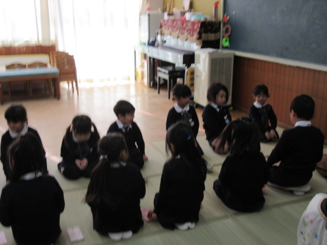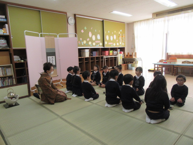 今日のお茶ごっこは、年長組が年中組をご招待して、おもてなしをしました。年中組は、年長組が運んでくれた初めてのお抹茶を、少し緊張した面持ちでいただいていました。