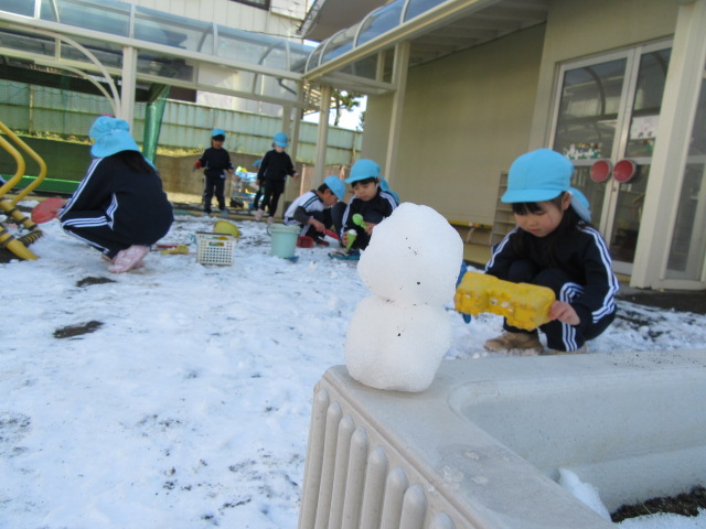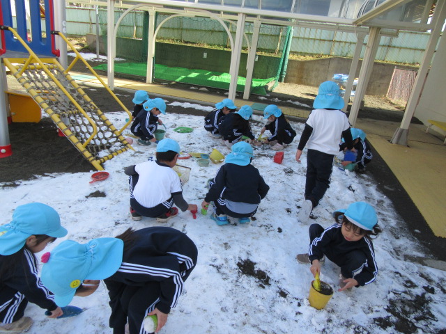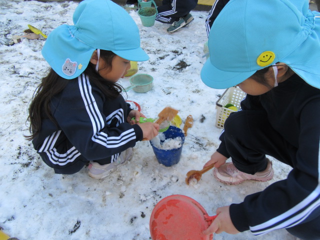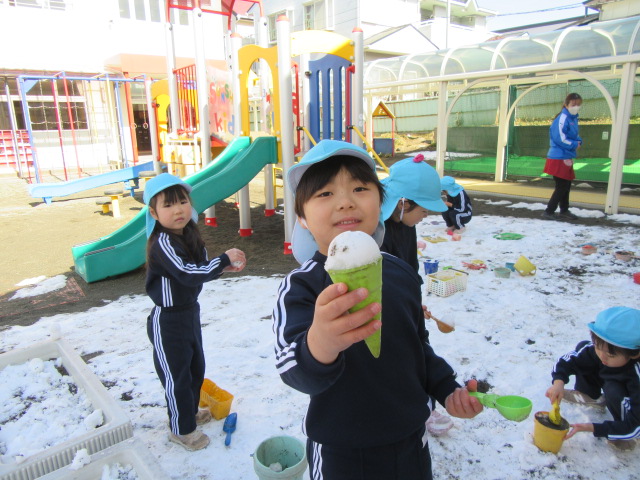 今日、すみれ組さんは、園庭に残っていた雪で雪遊びを楽しみました。少し硬くなった雪でしたが、みんな「冷た~い!」と言いながら素手で嬉しそうにアイスやケーキを作っていました。