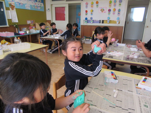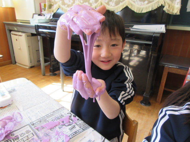 今日のサイエンス教室は、水、洗濯のりに、ホウ砂を加え、絵の具で色付けしたスライムを作りました。プラスティックのコップに材料を入れてを割り箸でぐるぐるかき回すと、どんどんドロドロに変わっていく様子に、大興奮でした!