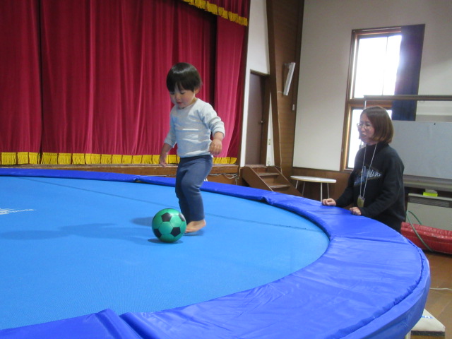 今日は、トランポリン教室のコーチに来ていただいて、トランポリンを楽しみました。年少組、年中組、年長組に加えて、ほしのこひろばのお友だちもおうちの方と一緒に楽しみました。可愛らしい笑顔がいっぱいでした!