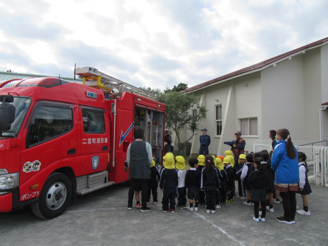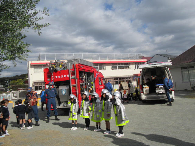 今日は火災を想定した訓練を行いました。消防車や救急車を見せていただいたり、防火服を試着させていただいて、消防士さんの大変さやカッコよさを学びました。