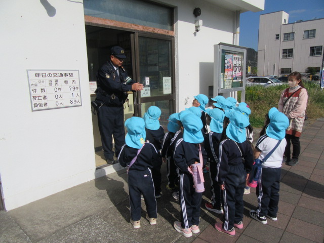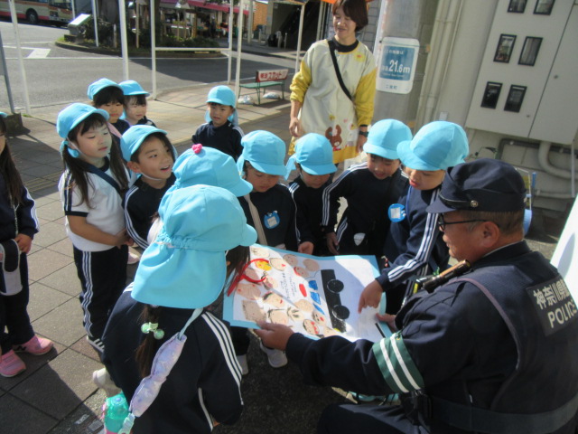いつも私たちの安全を守ってくださるおまわりさんに日頃の感謝を伝えるため、年中組さんが交番を訪問しました。みんなで作ったカレンダーをお渡しし、おまわりさんのお仕事を教えていただき、貴重なひとときを過ごしました。