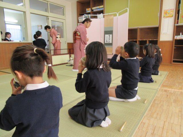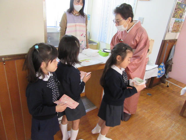 今日のお茶ごっこは、お茶をおもてなしする作法も体験しました。お菓子を食べ終わるタイミングをみてお茶を出したり、お茶を飲み終わるタイミングをみて片付けるなど、おもてなしの作法を学びました。