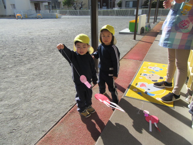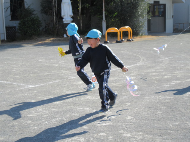 園庭でたこあげを楽しみました。すみれ組ははさみで渦巻状に切ったたこが、くるくる回るのを楽しみ、たんぽぽ組は、脚をのり付けしたタコの親子が風になびく様子を楽しみました。たんぽぽ組もみんな先生のお話をよく聞いて楽しそうに製作に取り組んでいました。